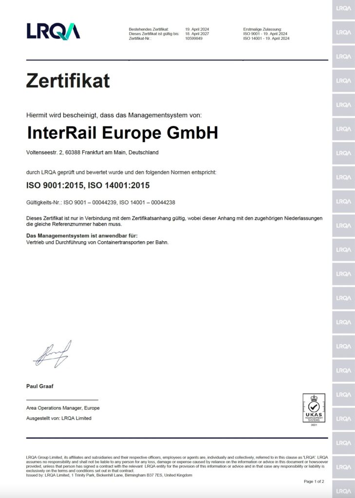 Unser Unternehmen ist bestrebt, sein integriertes Managementsystem zu verbessern, die geltenden Anforderungen und Verpflichtungen zu erfüllen, die Umweltleistung zu verbessern und die Umwelt im Rahmen unserer Tätigkeiten so weit wie möglich zu schützen. Auf diese Weise strebt InterRail Europe GmbH ein Gleichgewicht zwischen Kundenzufriedenheit und Minimierung der Umweltauswirkungen an.